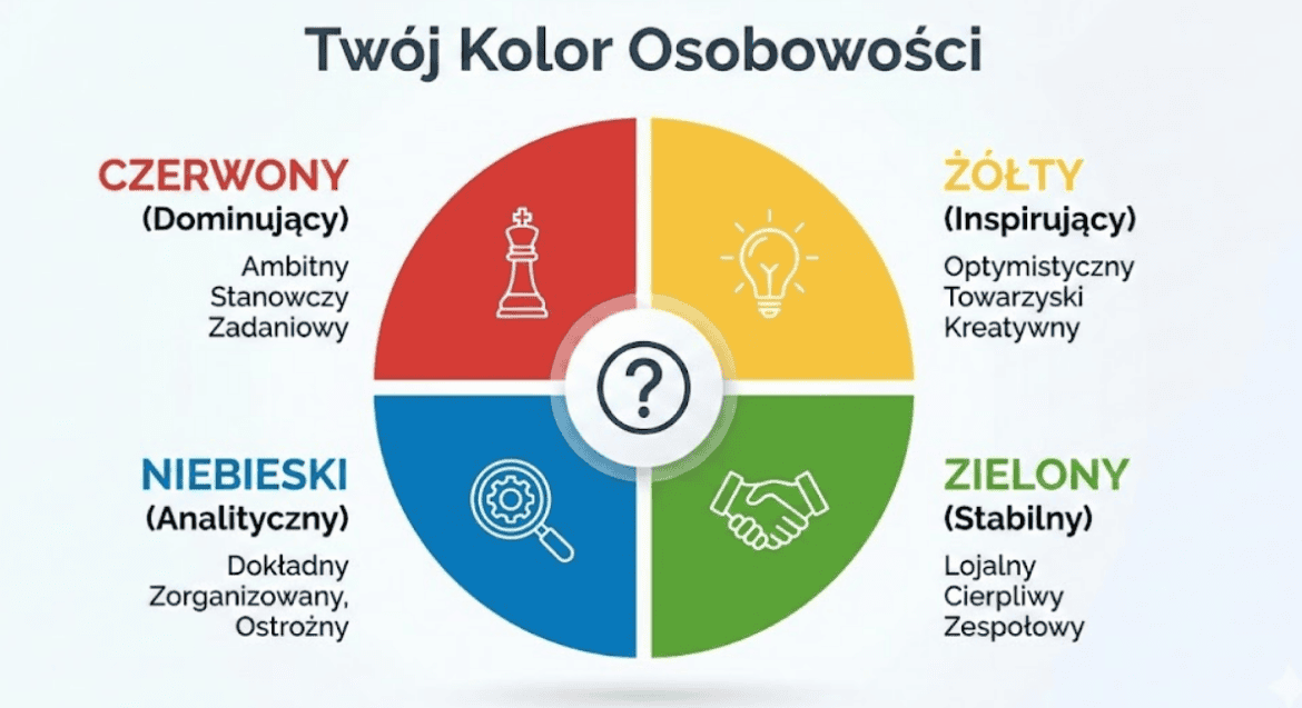 Czy zastanawiałeś się kiedyś, dlaczego z niektórymi osobami dogadujesz się bez słów, a inne wydają Ci się „z innej planety”? Odpowiedź tkwi w Twoim temperamencie i stylu komunikacji. Jednym z najbardziej intuicyjnych narzędzi do zrozumienia tych różnic jest model 4 kolorów osobowości (często kojarzony z metodologią DISC).
